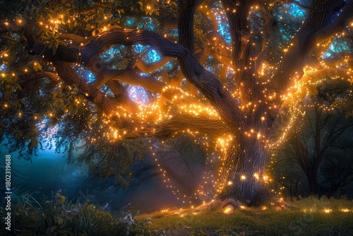 Naklejka premium Glowing fairy lights adorn a majestic oak tree in a magical, enchanted...