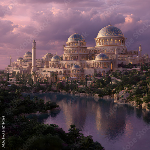 © Winda, Fototapeta premium Glowing Fantasy Mosque with Golden Domes by the River