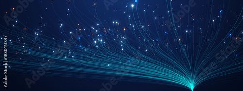 © your123, Fototapeta premium Glowing fiber-optic inspired data flow bursting outward, representing high-speed communication, big data transfer, AI networks, and advanced digital connectivity.