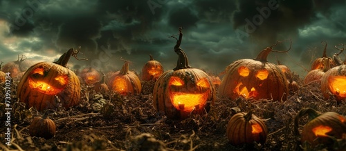 Fototapeta premium Glowing field of ripe pumpkins under a stormy dark sky at dusk