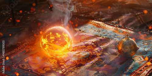 Naklejka premium Glowing Fiery Orb Resting on a Richly Patterned Rug Surrounded by Wisps of...
