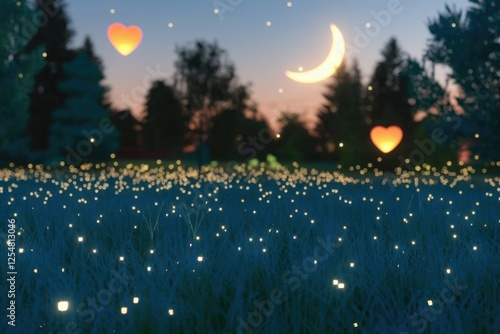 © Vibudhaart, Obraz premium Glowing fireflies illuminate a serene night field under a crescent moon and floating hearts.