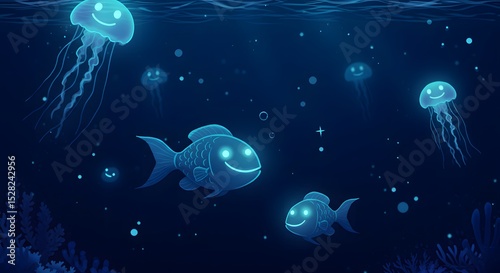 Naklejka premium Glowing Fish and Jellyfish Underwater Scene Digital Art
