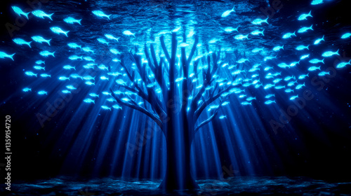 Obraz premium Glowing fish swimming around a submerged tree in the deep blue ocean