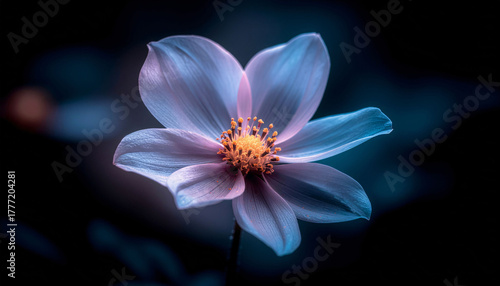 © Mahemud, Fototapeta premium Glowing flower background with neon petals, futuristic botanical art, dark contrast backdrop.