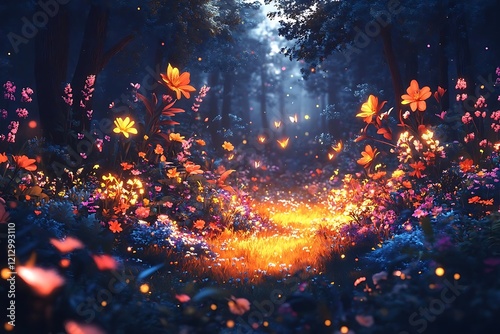 © Asih, Fototapeta premium Glowing flowers and butterflies illuminate a mystical forest path at night.