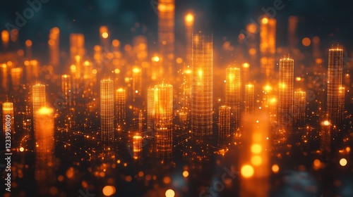 Obraz premium Glowing futuristic city, digital landscape, night, bokeh, technology, background