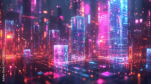 © loxia stock image, Obraz premium Glowing futuristic city with digital neon lights.