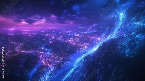 Fototapeta premium Glowing Futuristic Cityscape Under a Dramatic Sky with Light River