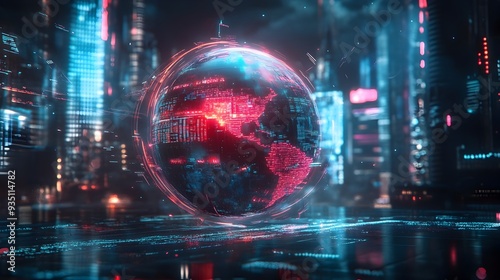 Obraz premium Glowing Futuristic Cityscape with Illuminated Holographic Globe Depicting...