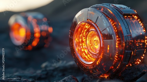 © elimicel, Obraz premium Glowing Futuristic Spheres on Volcanic Landscape