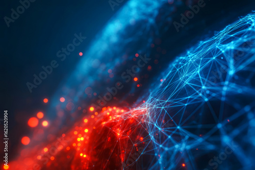 © Riaz, Obraz premium Glowing Geometric Network With Red Orbs abstract blue