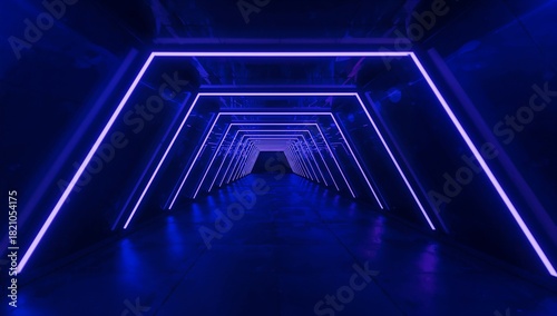 Fototapeta premium Glowing geometric tunnel stretching down corridor, with LED frames, metal...