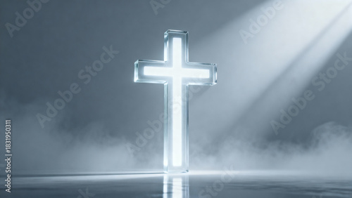 © Tina, Naklejka premium Glowing glass cross on a smoky background with dramatic lighting copy space