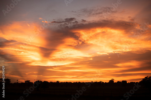 © Subhakitnibhat, Fototapeta premium Glowing gold, orange-red, cloudy sky at sunset. Wallpaper concept.