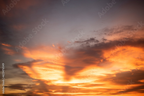 © Subhakitnibhat, Fototapeta premium Glowing gold, orange-red, cloudy sky at sunset. Wallpaper concept.