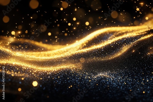 Obraz premium Glowing golden and silvery sparkling particles forming flowing waves against a dark background, creating a magical and dynamic visual effect