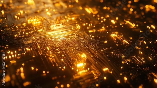 © rasya, Naklejka premium Glowing golden circuit board, close-up view.