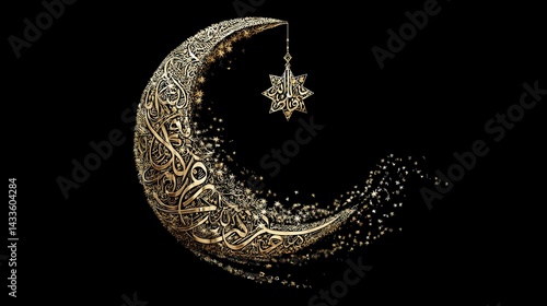 © Newleks, Obraz premium Glowing golden crescent moon adorned with delicate arabic calligraphy and star, symbolizing islamic artistic heritage against deep black backdrop