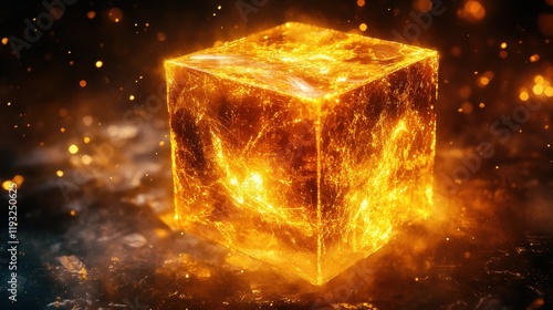 Fototapeta premium Glowing Golden Cube with Sparkles and Light Reflection in Darkness