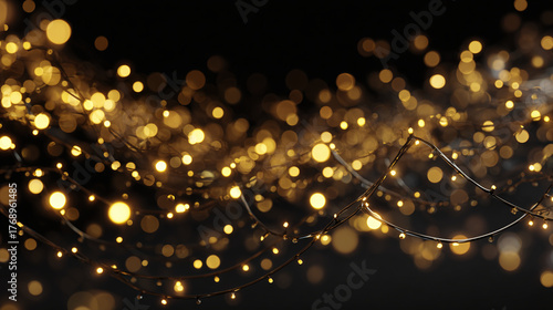 © Thiago, Obraz premium Glowing golden lights in a dark space, creating a festive atmosphere. The lights form an elegant, flowing design, with a blurred effect adding depth