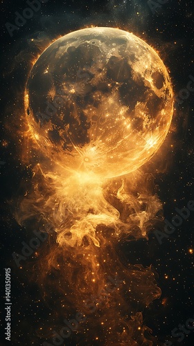 Fototapeta premium Glowing golden moon floating in cosmic space high resolution image