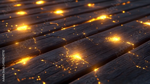 © Samima, Naklejka premium Glowing Golden Particles on Dark Wooden Planks