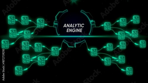 © SR, Obraz premium Glowing green analytic engine diagram with connected servers on black background network data analysis
