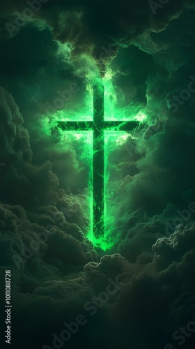 Naklejka premium Glowing green cross surrounded by storm clouds