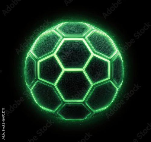 Fototapeta premium Glowing green hexagonal soccer ball on black background, emitting a soft light