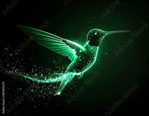 Naklejka premium Glowing Green Hummingbird Silhouette Flying on a Dark Background