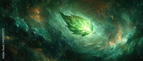 Fototapeta premium Glowing green leaf floating in a dark abstract swirling background.