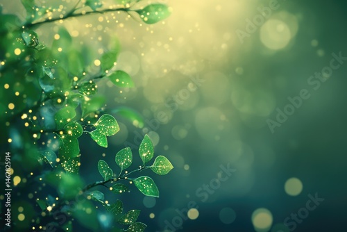 Obraz premium Glowing green leaves, bokeh background, magical, serene nature scene.