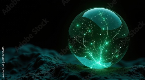 © Татьяна Антоненко, Obraz premium Glowing green orb on textured surface with intricate light patterns.