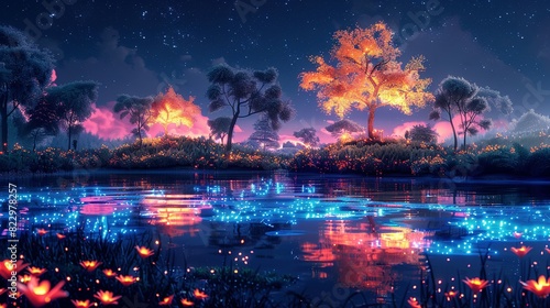 © Achaa, Fototapeta premium Glowing Grove: Cartoon Neon Night Forest
