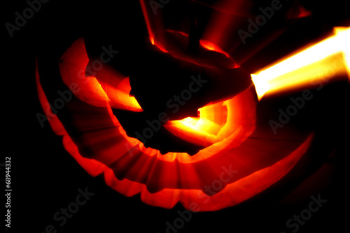 © yellowj, Fototapeta premium Glowing Halloween pumpkin