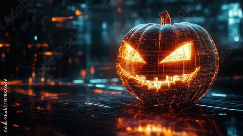 Naklejka premium Glowing Halloween Pumpkin Cyberpunk Cityscape