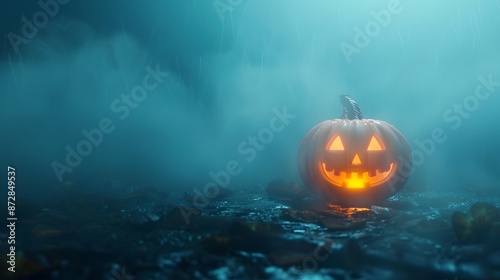 Naklejka premium Glowing Halloween Pumpkin in Foggy Forest