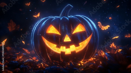 © O, Naklejka premium Glowing halloween pumpkin jack lantern on a dark night with falling leaves and bats. Spooky seasonal decoration. Samhain