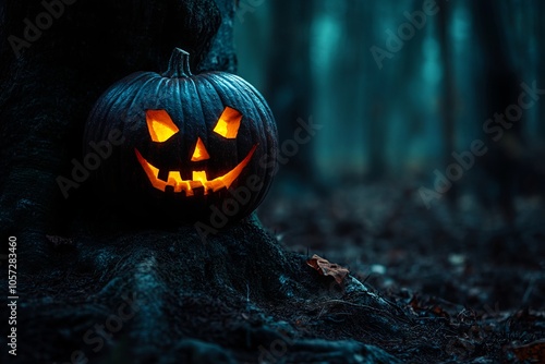 © Vugar, Naklejka premium Glowing Halloween Pumpkin on Old Tree in Dark Forest - AI generated illustration