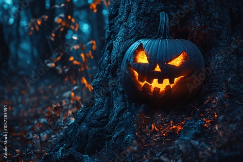 © Vugar, Fototapeta premium Glowing Halloween Pumpkin on Old Tree in Dark Forest - AI generated illustration