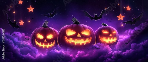 Fototapeta premium Glowing Halloween Pumpkins Party Celebration in Purple Background with Bats and Stars