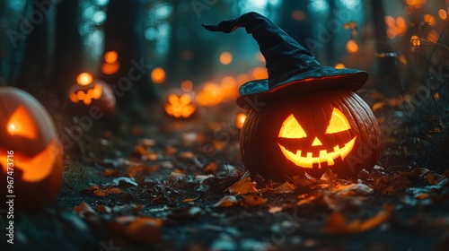 © Tabassum, Fototapeta premium Glowing Halloween Pumpkins with a Witch on a Spooky Night