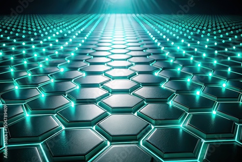 © kittipon, Obraz premium Glowing Hexagonal Grid Floor, Teal Gradient Background