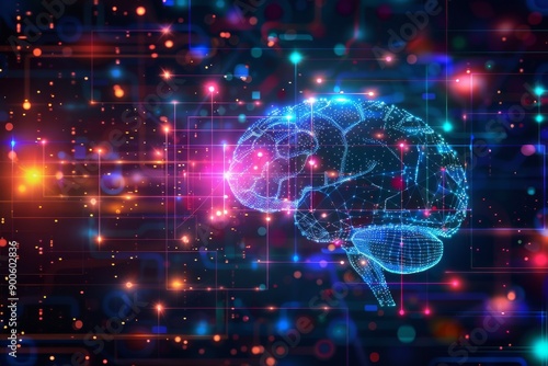 Obraz premium Glowing holographic brain with data streams on digital interface background