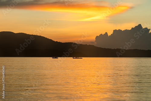 © explorewithinfo, Obraz premium glowing horizon over calm backwater with boats at evening sunset