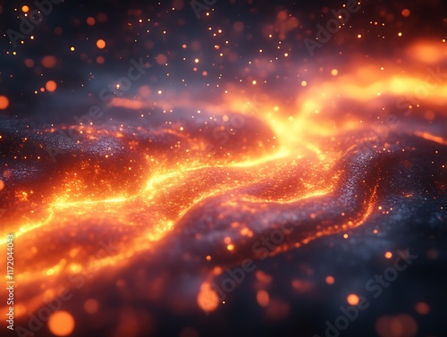 © Mukib, Fototapeta premium Glowing hot lava flows on dark surface.