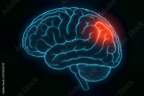 © RISHAD, Fototapeta premium Glowing human brain with highlighted red area on black background