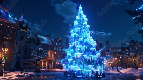 © Tatiana, Obraz premium Glowing ice sapphire Christmas tree on the city square. Christmas and New Year celebration concept.