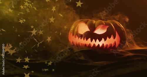 Naklejka premium Glowing jack lantern with stars image over smoky background